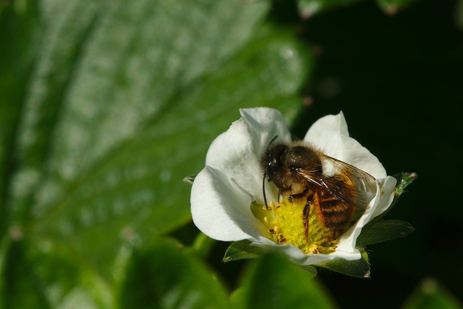 - Imatge 3 . Abella solitària del gènere Osmia pol·linitzant una maduixera. La conservació de marges, prats i matollars afavoreix els insectes que pol·linitzen els conreus. (Foto: Guillem Bagaria – XCN)