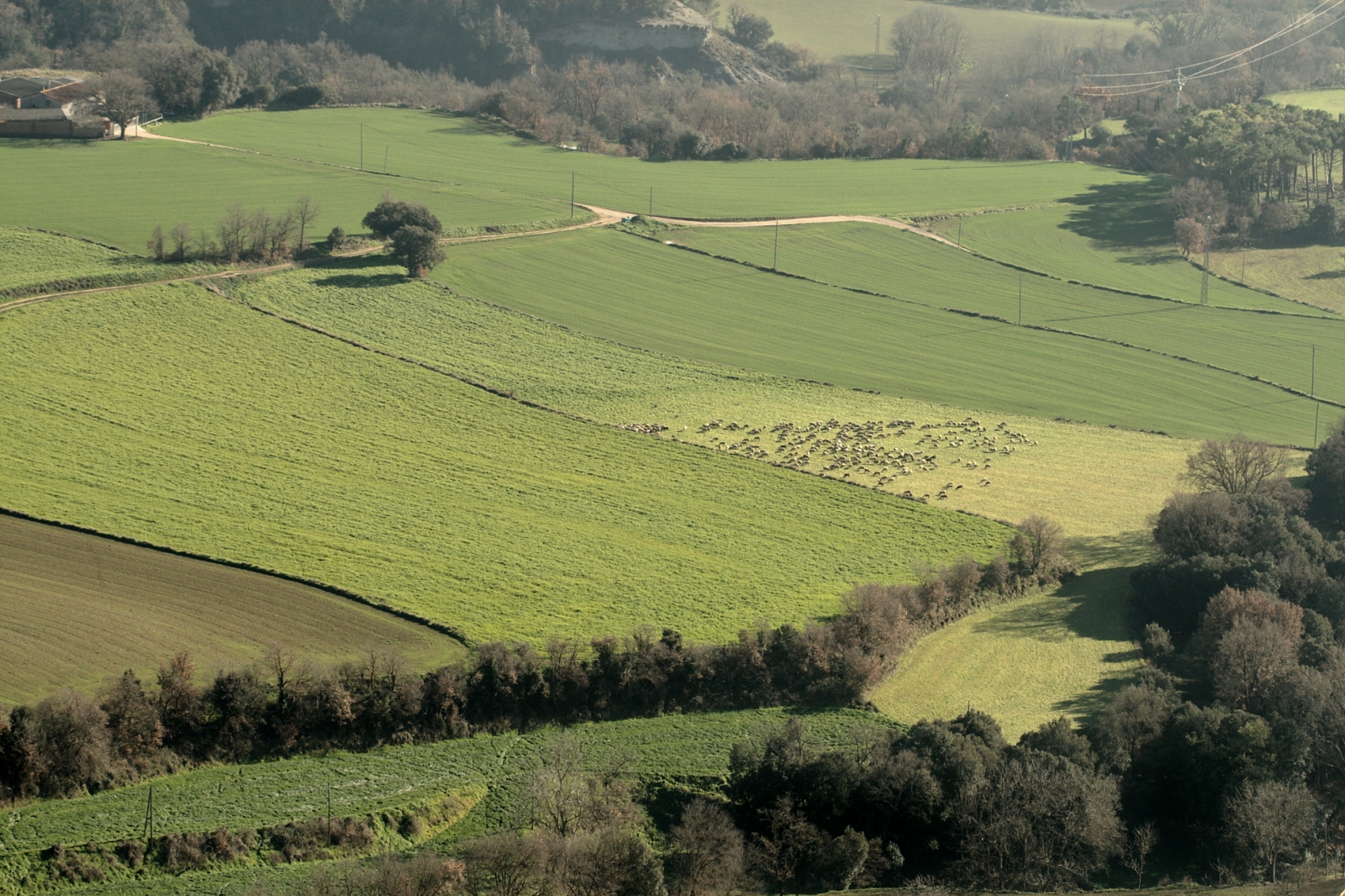- Imatge 5. Paisatge agrari amb bosquets i marges arbrats a Santa Cecília de Voltregà. Els mosaics agroforestals fomenten la biodiversitat, el control biològic de plagues i la protecció contra fenòmens meteorològics extrems com ventades, inundacions o sequeres (Foto: Guillem Bagaria – XCN)