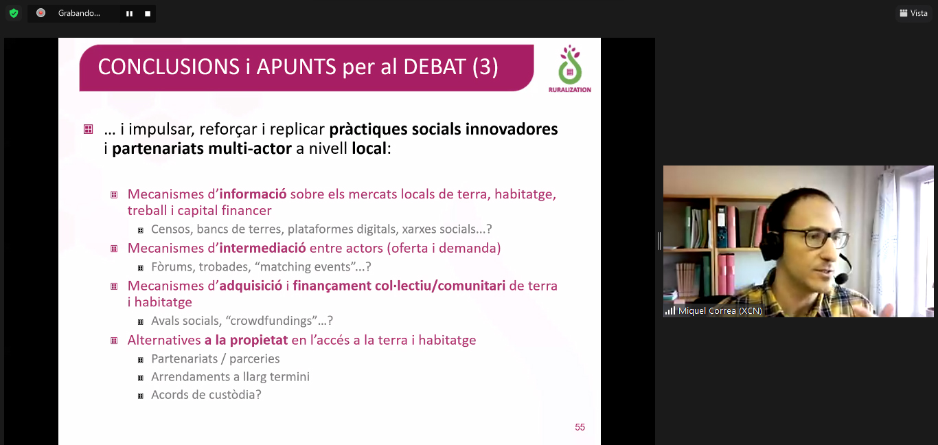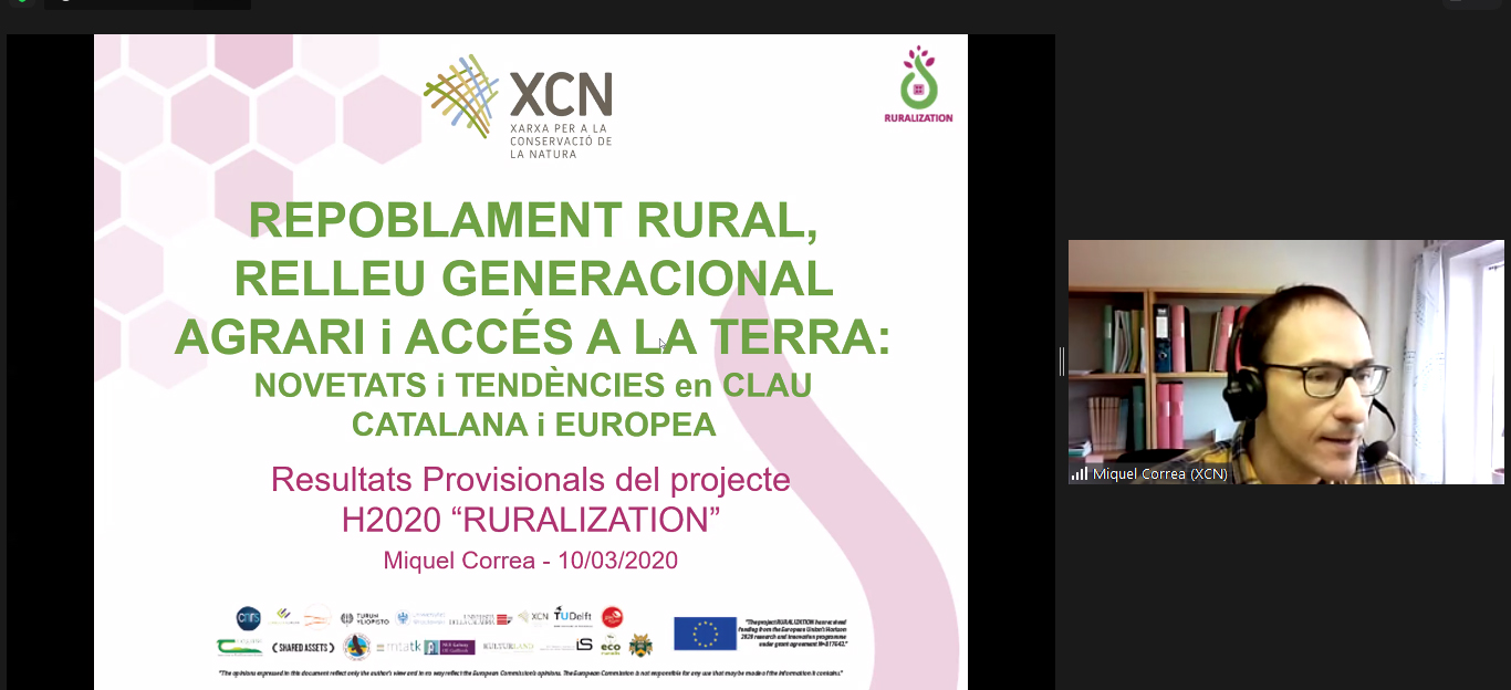 Aprofitant que aviat arribem a l’equador del projecte «RURALIZATION», el passat dimecres 10 de març vam organitzar la conferència « Repoblament rural, relleu generacional agrari i accés a la terra: novetats i tendències en clau catalana i europea », que va comptar amb l’assistència d’una cinquantena de persones. La conferència havia de servir per presentar les principals línies de treball del projecte i alguns dels resultats provisionals assolits fins ara. A més, des de la XCN vam considerar oportú aprofitar l’ocasió per a organitzar un debat sobre el futur del sector agrari i el món rural , que va comptar amb la col·laboració del Departament d’Agricultura, Ramaderia, Pesca i Alimentació de la Generalitat de Catalunya (DARP); l’Associació d’Iniciatives Rurals de Catalunya (ARCA); l’Escola de Pastors; el Parc Agrari del Baix Llobregat; i la plataforma «Repoblem». Tot plegat, en format virtual i facilitat per la Neus Monllor, consultora agrosocial, membre del consell assessor del consorci que executa el projecte Ruralization, i habitual col·laboradora de la XCN en diferents projectes vinculats al sector agrari i el relleu generacional en particular.