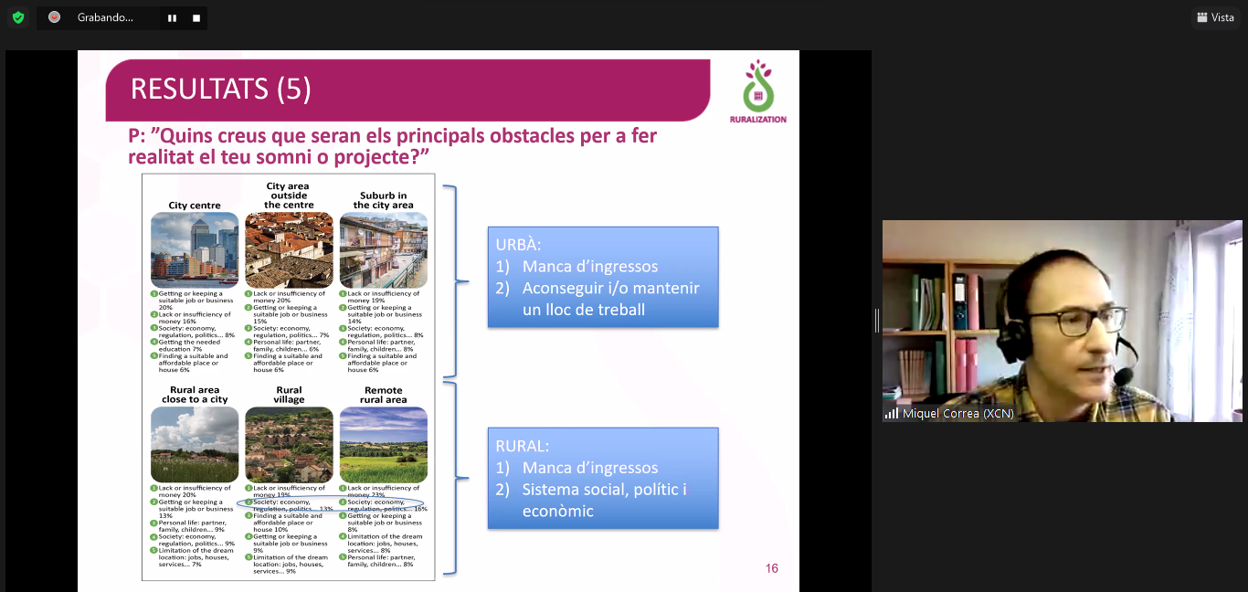 Des de la XCN, doncs, vam recapitular les dades bàsiques i resultats vinculats a les tres principals línies de treball del projecte: la captació de tendències i expectatives de futur en les regions rurals , l’anàlisi del relleu generacional agrari i l’anàlisi de la problemàtica de l’accés a la terra. Quant al primer bloc de treball, vam poder exposar, per exemple, els resultats consolidats a nivell europeu de les enquestes que vam realitzar les diferents organitzacions durant la primavera i estiu de 2020, i que ja vam explicar en el seu moment per a la mostra de Catalunya . A destacar, entre altres, aquest potencial de repoblament rural a mig termini que s’observa entre la població juvenil europea (18-30 anys), amb un increment del 33% en la preferència de viure en entorns rurals , especialment aquelles localitats properes a una ciutat, però molt menys en localitats remotes. La distància a la ciutat , doncs, percebuda sovint com a centre proveïdor de llocs de treball, serveis i equipaments, apunta com un factor clau en la decisió sobre la localització dels projectes personals i professionals de futur de les generacions futures. És interessant observar com aquesta dada pot explicar també un altre dels resultats de l’estudi, que és el major interès per l’emprenedoria i el desenvolupament de projectes professionals autònoms de les joves europees residents en localitats rurals de caràcter més remot (o, si més no, no tant properes a entorns urbans).